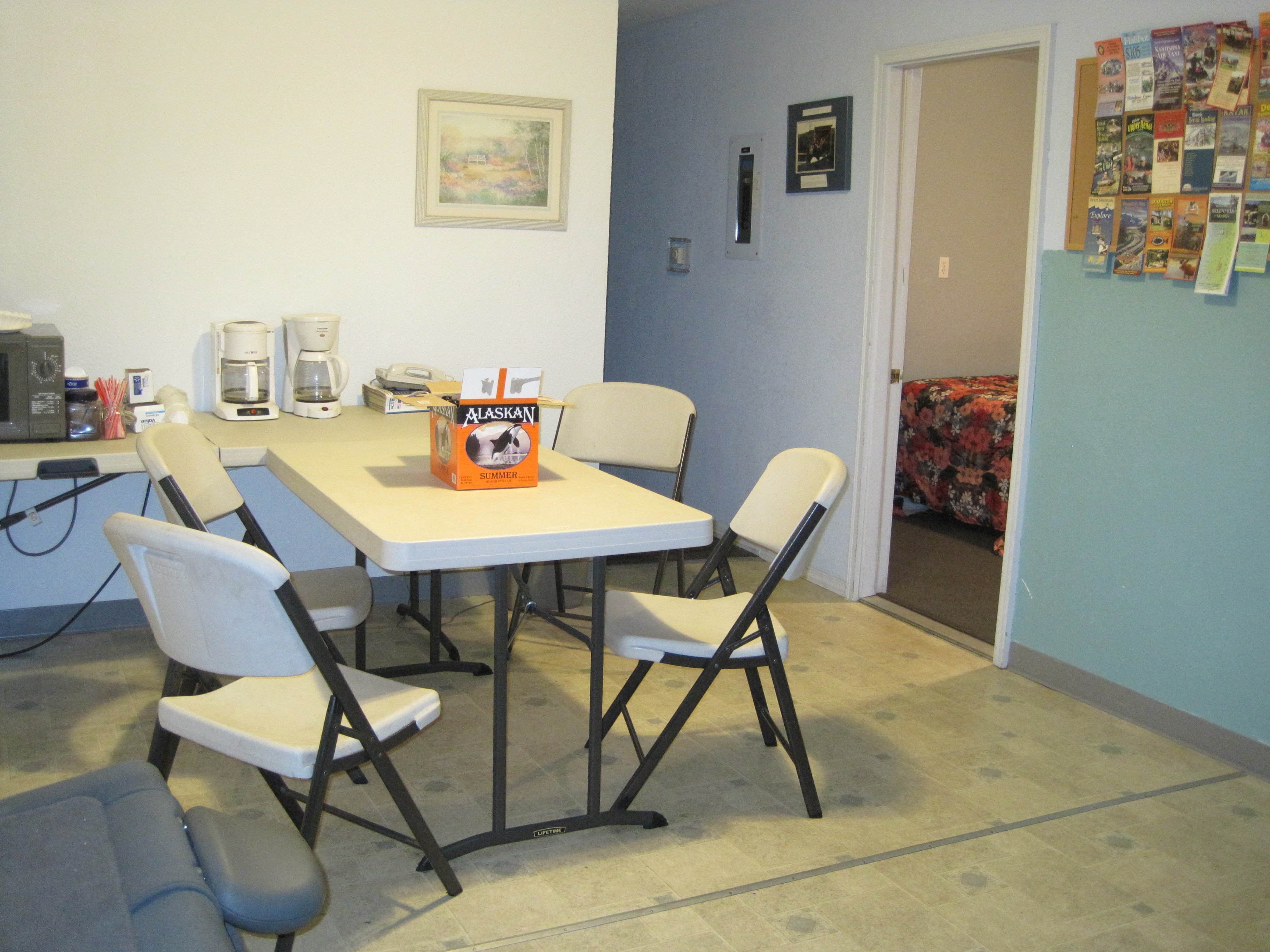 Anyway, the fun continued the next morning when we grabbed some breakfast from the shared main room and retreated, not wanting to use the shower despite its apparent cleanliness.   We had to wait until ~10 am for our rental car  and we couldn’t sleep in the smoke choked room past seven we went for a walk.   An interesting site in Alaska are the little coffee huts on many corners.  We wimped out and went and sat at the nice starbucks in the local Barnes & Noble store.  Around nine we headed back to make sure we were packed and ready to go.  That’s when the domestic dispute started upstairs.  F-bombs and heavy thumping proceeded.  I called Enterprise to see if they would pick us up early, nope.  We endured this for a while and finally just stood outside in the rare sun and nice temps.  Finally we checked out and were picked up by a friendly Enterprise lady.